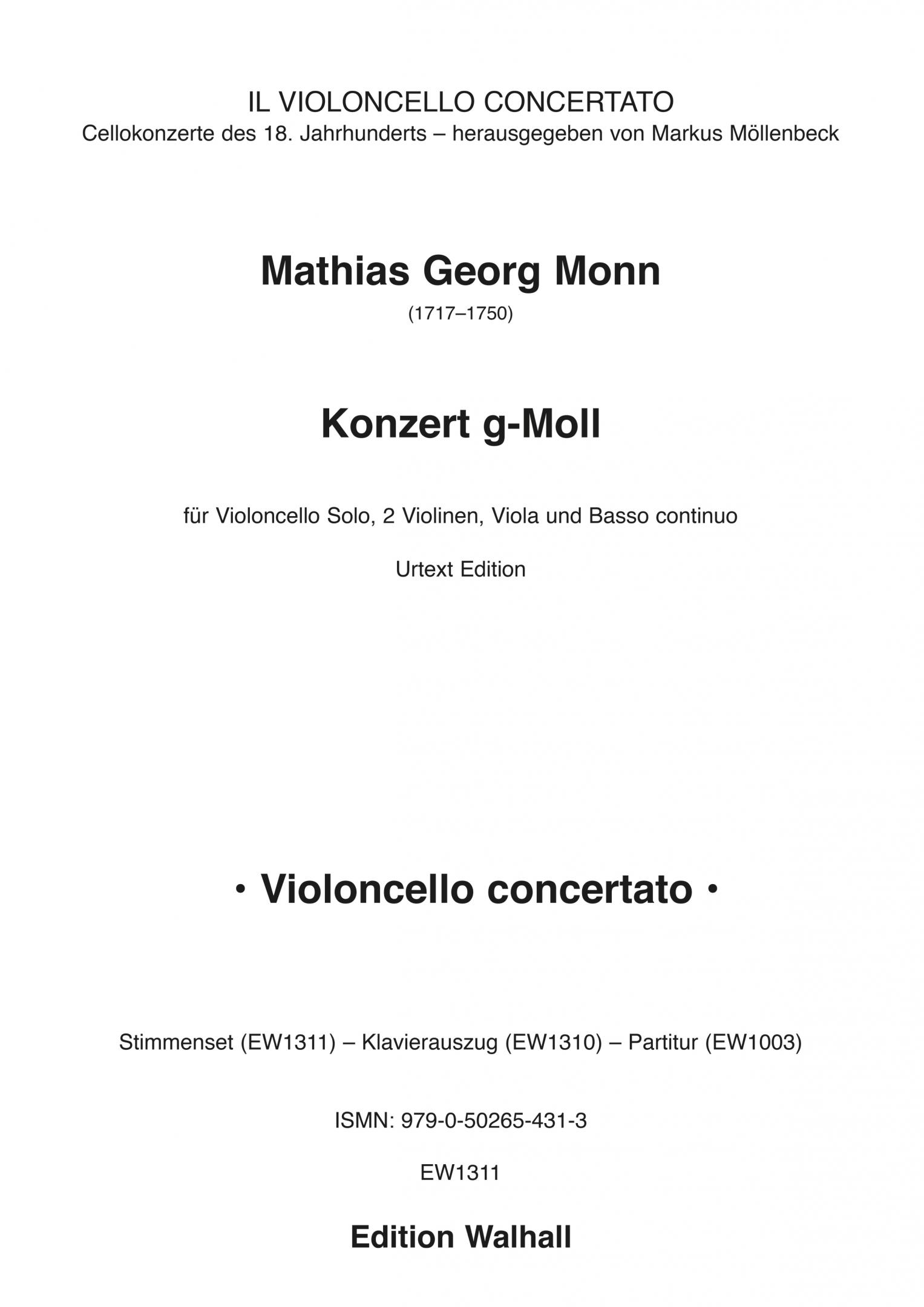für Violoncello Solo, 2 Violinen, Viola & B. c., herausgegeben als Urtextausgabe (Durata: 17’) von Markus Möllenbeck mit einem Klavierauszug von Roland Steinfeld. Monn war einer der großen Wiener Musikbegabungen des 18. Jahrhunderts, der schon mit 33 Jahren starb. Später machte er daraus sogar noch ein Cembalokonzert in derselben Tonart. Das Cello-Konzert weckte das Interesse von Arnold Schönberg, der es 1912 in den DÖT herausgab und einen Klavierauszug erstelle. Darüber hinaus benutzte dieser 1933 ein anderes Cembalokonzert Monns in D-Dur, um daraus ein Violoncellokonzert in seiner eigenen Orchestrierung zu machen. Das hier vorliegende g-Moll-Konzert wurde in unserer Zeit besonders durch Jaqueline du Pré populär gemacht, die es häufig spielte und auch aufgenommen hat. Kritische Urtextausgabe mit möglichst geringen Herausgeberzusätzen zu publizieren. Reihe Il Violoncello concertato