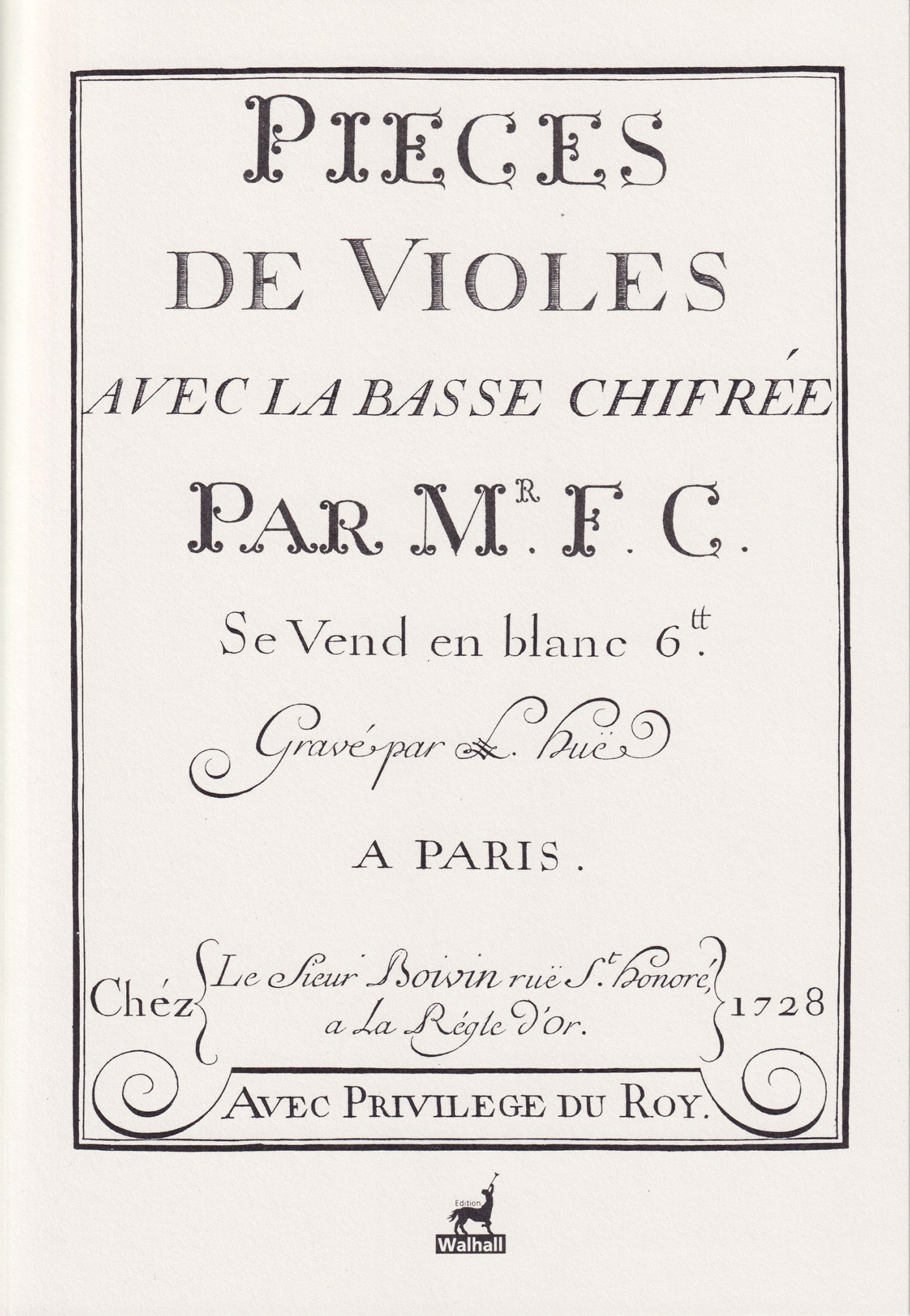 avec la basse chiffrée. Paris 1728, for Viola da Gamba & B. c., Facsimile, Minkoff-Reprint.