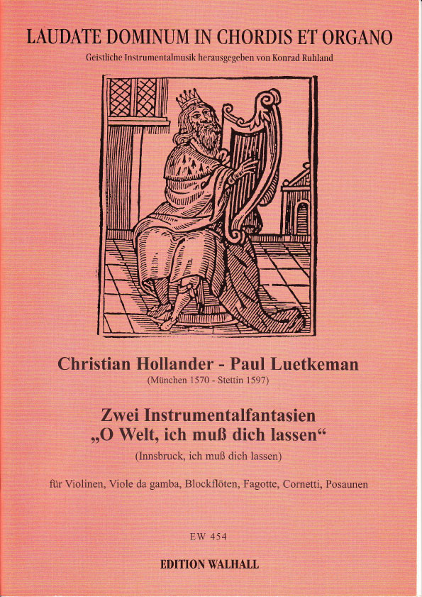 two fantasias à 5 over "O Welt, ich muss dich lassen" ("Innsbruck, ich muß dich lassen") for 2 violins (recorders/cornetti), 2 viols (bassoons/trombones), basso & organ, edited by Dr. Konrad Ruhland. The piece of Leutkeman is recorded by Musica Antiqua Köln, directed by Reinhard Goebel: CD "Musica Baltica" (DG-Archiv Nr. 459619-2). New edition. Series Laudate Dominum in chordis et organo